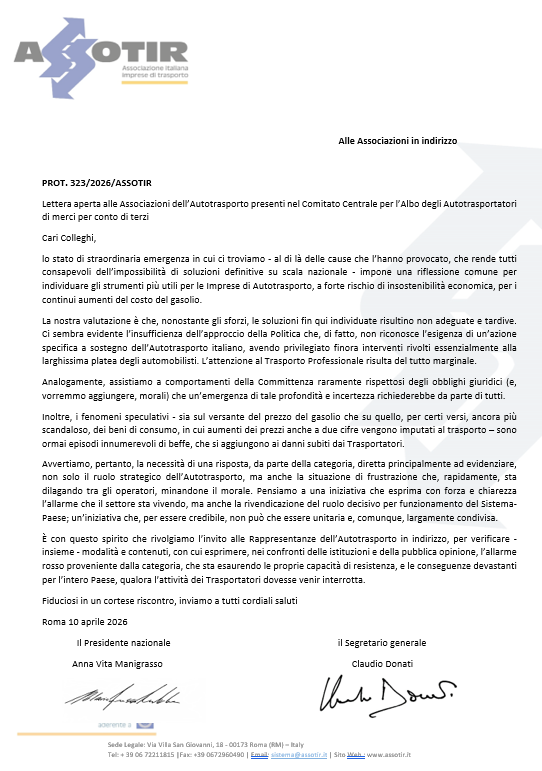 La decisione di inviare la missiva è stata assunta dal Consiglio Direttivo Nazionale di ASSOTIR riunitosi nel pomeriggio del 9 aprile 2026; di seguito è possibile leggere il testo della lettera: