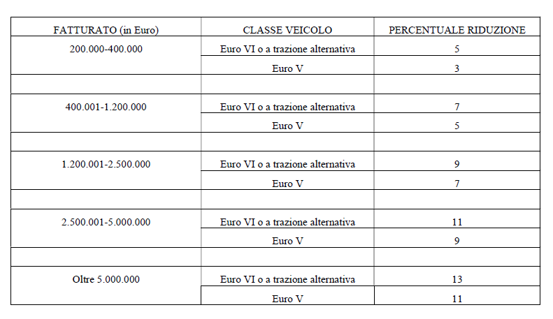 Le risorse, pari a 140 milioni, verranno suddivise tra le imprese beneficiarie attraverso un sistema di calcolo che differenzia le percentuali di riduzione non solo in funzione del fatturato in pedaggi dell’impresa, ma anche della classe ecologica dei veicoli utilizzati in autostrada, secondo gli scaglioni di fatturato e le percentuali teoriche indicate nella seguente tabella: