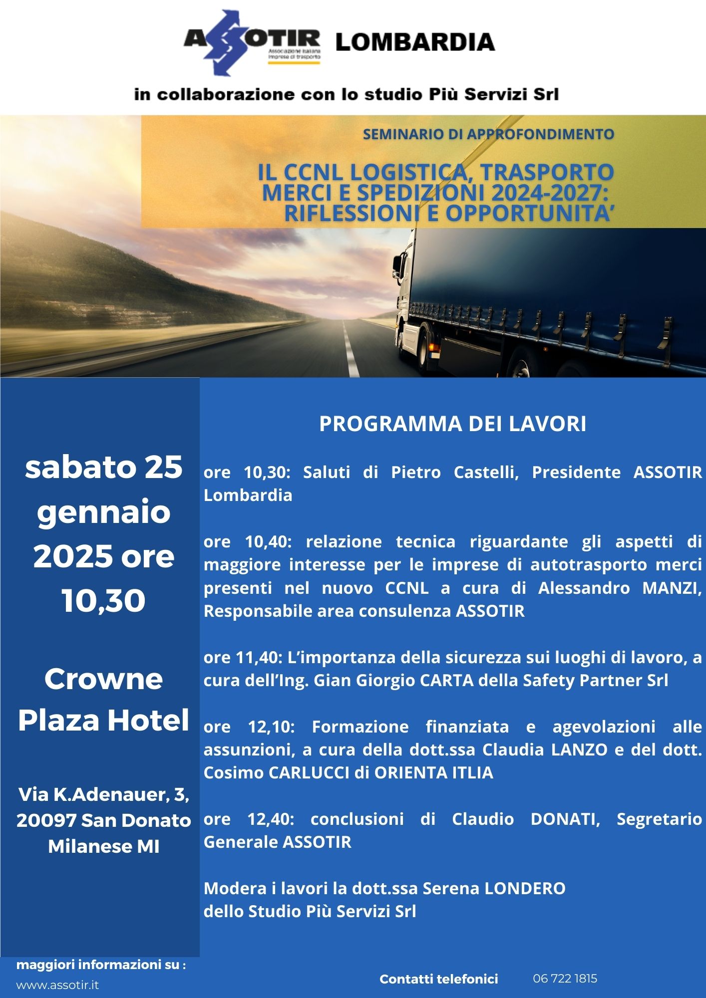 Si terrà sabato 25 gennaio 2025, alle ore 10,30, presso il Crowne Plaza Hotel di San Donato Milanese (MI), il seminario di approfondimento sul nuovo CCNL Logistica, Trasporto merci e Spedizione di ASSOTIR LOMBARDIA organizzato con la collaborazione dello studio Più Servizi Srl.